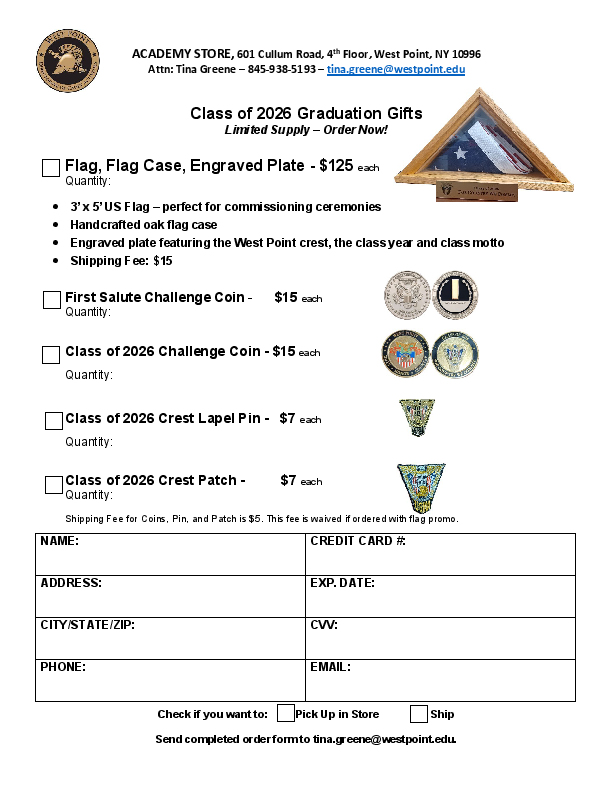 • The West Point Parents Club of New Jersey will be in the grassy area behind the bleachers on Friday selling coins with the class crest. Proceeds will be donated to the class for its gift fund.