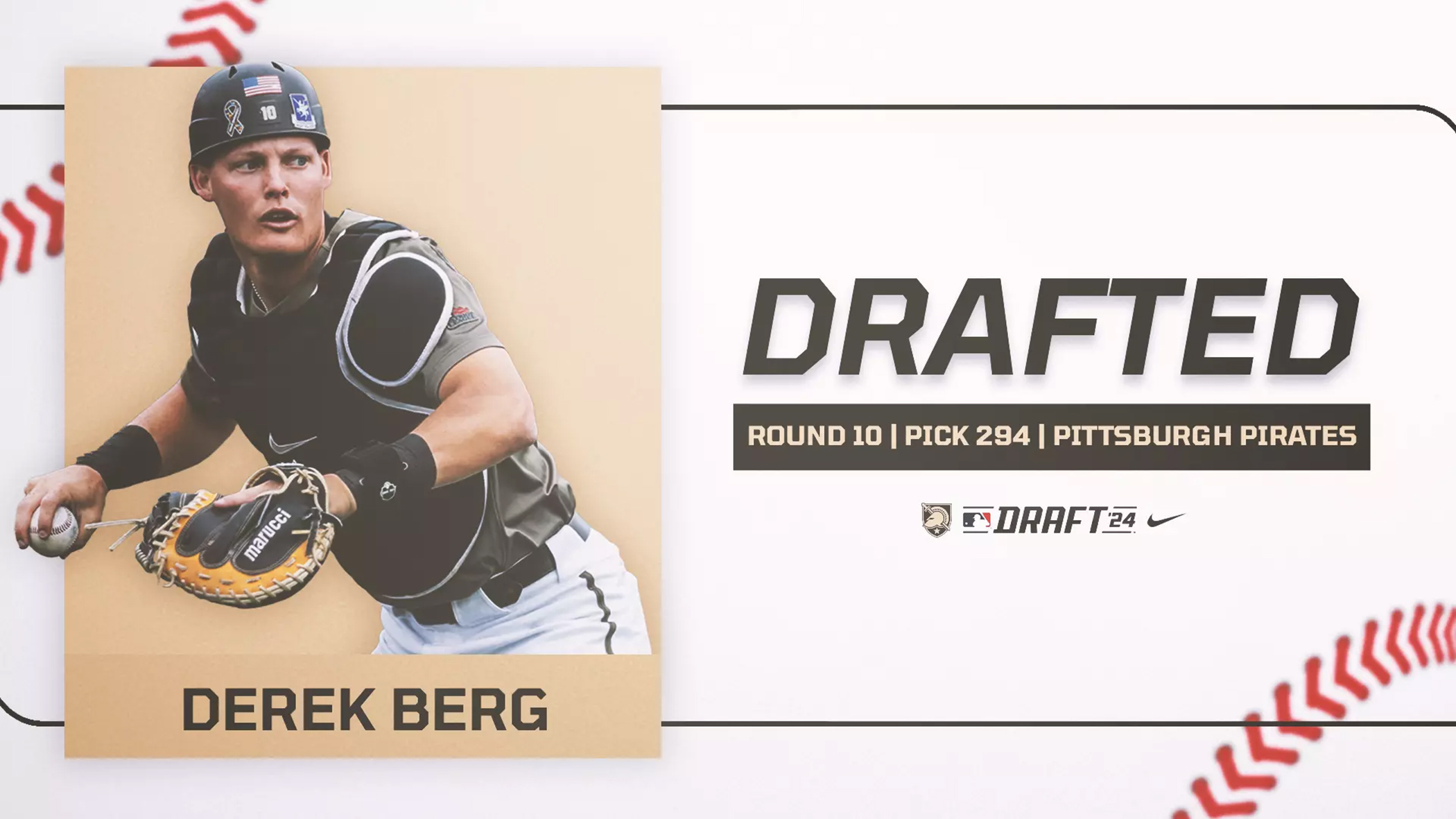 Army West Point Baseball's Derek Berg was selected July 15, 2024, by the Pittsburgh Pirates in the 2024 Major League Baseball Draft, with the No. 294 overall selection in the 10th round. ...