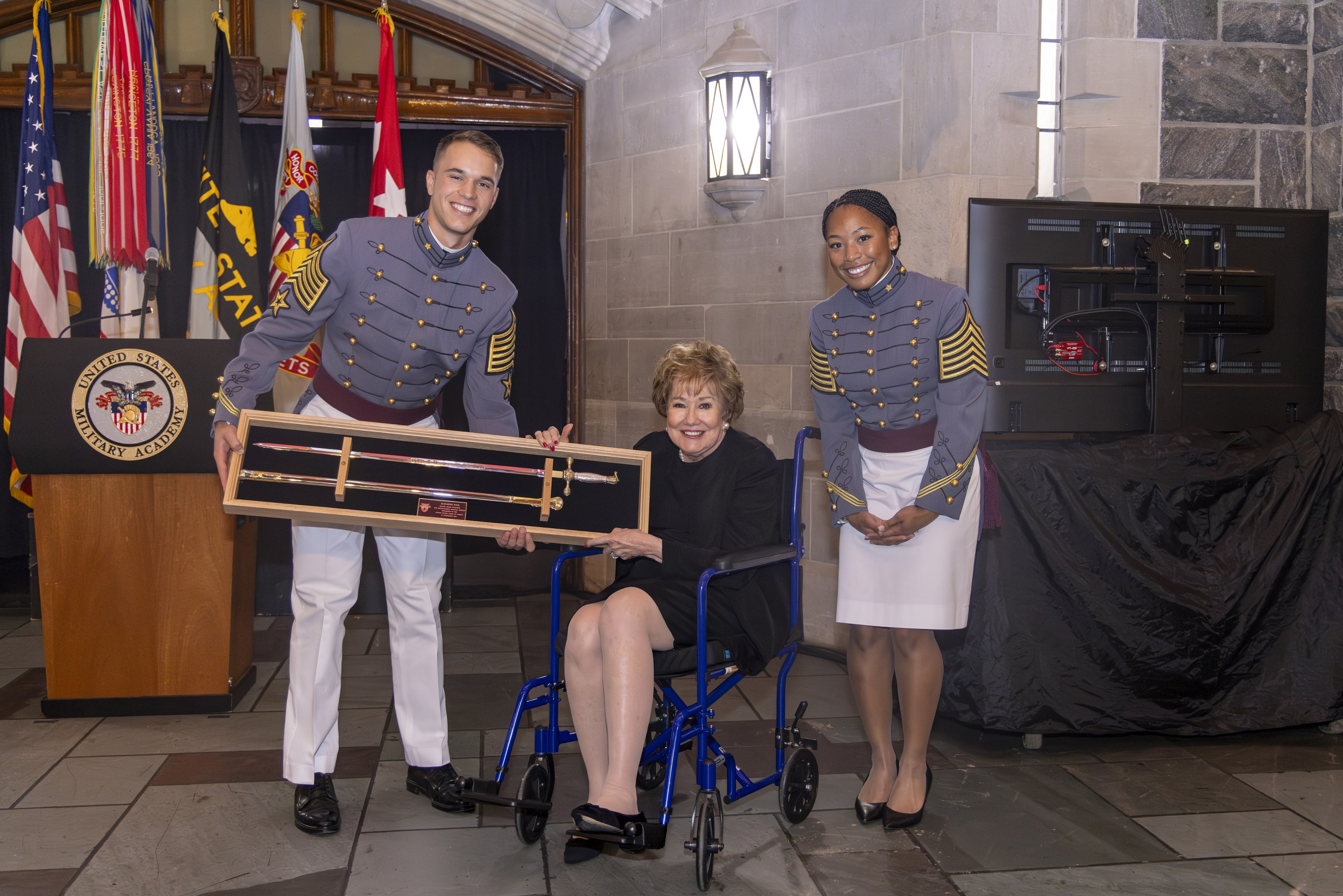 Afterward, the banquet was held at the Cadet Mess Hall, where Elizabeth received the Thayer Award, marking her and her husband, Senator Bob Dole, the first married couple to receive their respective Awards, with Bob receiving it in 2004.